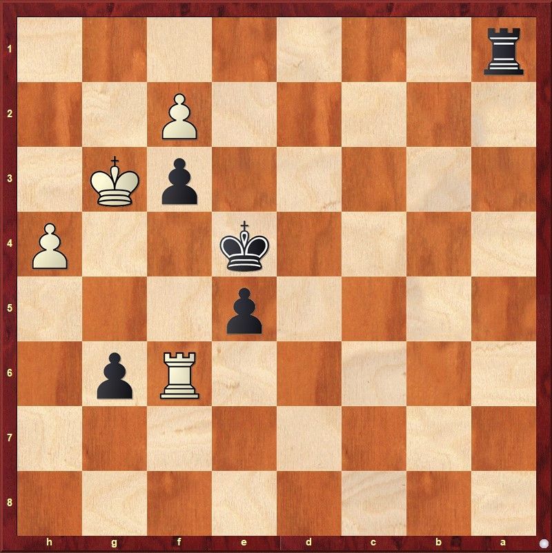Weiß zog jedoch Kh2 und nach Tf1, Txg6 Txf2+ ist der schwarze f-Bauer schneller als der weiße h-Bauer und entscheidet die Partie.